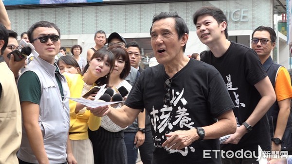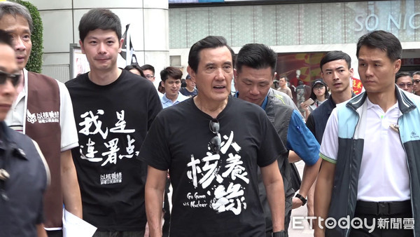 馬英九穿上“我是人,我返核”黑衣上街頭發聯署書。(圖片來源:臺灣“東森新聞云”)