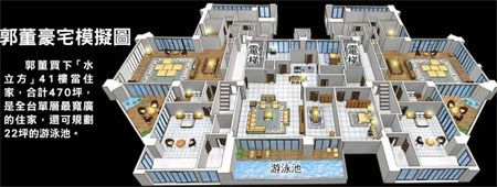 開發商原規劃41樓為超豪宅產品,單層單戶470坪,開價3億元,郭臺銘一口氣要買3個樓層,從39樓到41樓全包下,總坪數1410坪。41樓將與狗狗、寶貝小女兒妞妞共筑溫暖的家,40樓與39樓將規劃為鴻海集團招待所。