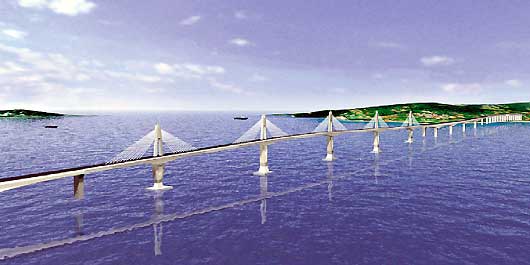 中國臺灣網1月9日消息 據臺灣《聯合晚報》報道,島內最長的跨海大橋“金門大橋”,今天下午舉行動土典禮,馬英九、臺當局“行政院長”吳敦義特地前往金門出席見證。這座金門居民等待多年的橋,造價75億元(新臺幣,下同),預計2016年6月完工通車,到時民眾就可開車或騎自行車游覽大小金門。金門大橋最大跨徑280米,是目前全世界最大跨徑脊背橋,建成后將成為金門景觀的新景點。
