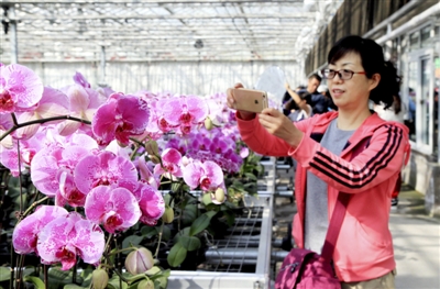 由臺(tái)商投資控股的上海雍大實(shí)業(yè)有限公司與新疆生產(chǎn)建設(shè)兵團(tuán)第六師五家渠市簽訂了8億元投資協(xié)議,在五家渠市建設(shè)一個(gè)年產(chǎn)3000萬株蘭花的種植基地。目前,基地內(nèi)已建成2萬余平方米的展區(qū),種植了130余種各色蝴蝶蘭,主要銷往我國(guó)西北地區(qū)及絲綢之路沿線各地。圖為近日游客在五家渠市雍大蘭花莊園游覽并拍照留念。 魏新江攝(人民圖片)