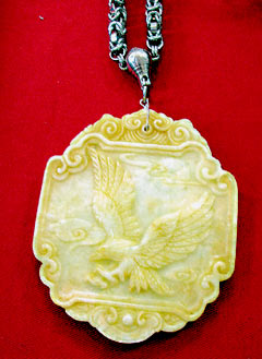 臺灣警方掃蕩四海幫海云堂,搜出一塊雕有飛鷹圖案的玉佩,據(jù)稱可以保命,如同古代“免死金牌”。來源:臺灣《聯(lián)合報》