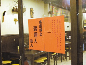 據(jù)臺灣《聯(lián)合報》報道,看到中華臺北隊跆拳道選手曾敬翔在東亞運因韓國選手犯規(guī)動作而失金,臺灣苗栗一家火鍋店老板倍感不平,竟貼出“本店禁止韓國人進入”的告示,引起饕客側(cè)目詢問。