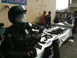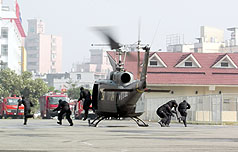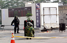 “2007金華演習(xí)實(shí)兵演練”6日在高雄市舉行,假設(shè)2009年世運(yùn)期間高鐵左營(yíng)站遭恐怖攻擊,展現(xiàn)軍警對(duì)世運(yùn)維安的應(yīng)變能力。圖為模擬處理左營(yíng)車(chē)站爆裂物。 來(lái)源:“中央社”