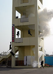 圖為假設(shè)高鐵左營(yíng)站遭恐怖恐擊,歹徒將人質(zhì)挾持至附近大樓,空降維安特勤人員攻堅(jiān)營(yíng)救人質(zhì)。