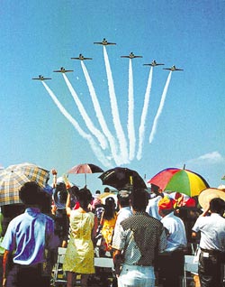 空軍雷虎小組也是遠東地區第一支特技飛行小組,成立初期就以精湛技術揚名國際。1957年,在菲律賓航空周首開先例九機編隊表演;1959年赴美參加第一屆航空表演,以九架軍刀機做低空表演贏得贊譽。