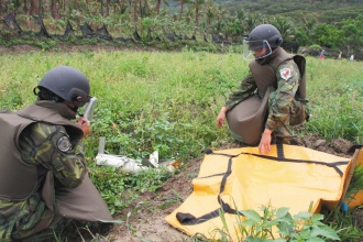 臺陸軍未爆彈處理小組人員檢視墜落莊姓民宅旁田里的“陶”式導彈尾翼,放入防爆毯帶回處理。(圖片來源:臺灣《聯合報》)