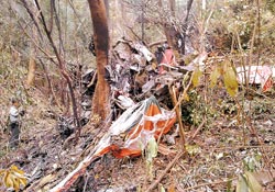 ▲一架編號3402的臺空軍T-34雙座教練機,15日下午在高雄縣六龜鄉(xiāng)紅水坑墜毀,機體扭曲變形,卡在樹干間仍持續(xù)冒煙。圖片來源:臺灣《中國時報》