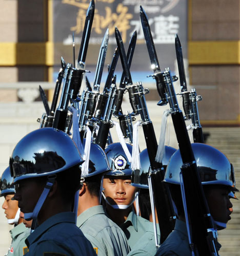 天氣雖冷,臺北市28日白天陽光普照、增添暖意,臺軍“三軍儀隊”在“中正紀念堂”自由廣場練習操槍,精彩的動作,讓觀光客看了頻頻鼓掌。 圖片來源:“中央社”