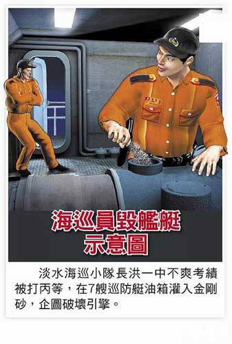 前年11月27日,洪一中(43歲)因不滿先前喝酒被上級(jí)懲處,年終考績(jī)只有丙等,伙同分隊(duì)長(zhǎng)李文波(45歲)共謀將硬度極高的金剛砂倒入7艘平均造價(jià)7000萬新臺(tái)幣)的巡防艦艇引擎,企圖破壞引擎報(bào)復(fù)。幸好海巡隊(duì)在保養(yǎng)時(shí)及時(shí)發(fā)現(xiàn),耗費(fèi)65萬元新臺(tái)幣逐一檢查清除,才避免船只損壞。