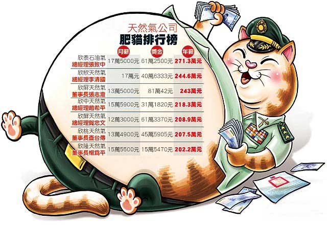 “立委”蔡煌瑯質疑,臺當局“退輔會”指派天然氣公司董事長、總經理,都是臺軍退役中、少將,都有領十八趴優利的退伍金,還年薪破百萬,有人的座車選凌志460,光月租費就7萬多元,“不是肥貓是什么!”