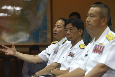 臺軍海軍司令董翔龍上將(左)6日率領相關人員出席記者會,說明臺灣168艦隊隊長張鳳強少將逾越操演范圍的經過。圖片來源:臺灣“今日新聞網”