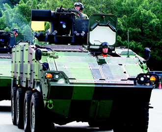臺軍“憲兵司令部”昨天進行動態操演,云豹八輪裝甲車亮相。(圖片來源:臺灣《聯合報》)