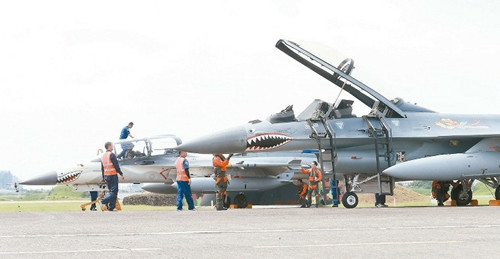 據臺灣《聯合報》報道,為慶?箲饎倮70周年,臺灣空軍特別在現役F—16、IDF戰機“重現”飛虎隊鯊魚頭涂裝,彩繪機8日在新竹基地亮相,讓軍事迷興奮不已。