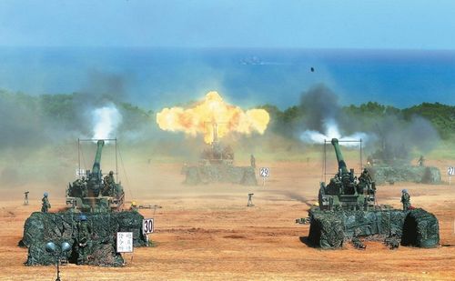 火炮射擊漢光演習反舟波射擊,3類38門中長程自走火炮同時射擊,場面壯觀。來源:臺灣《聯(lián)合報》