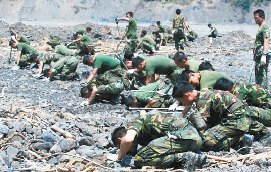 在六龜鄉新開部落搜救的臺軍官兵,昨天趴在可能埋尸的泥石流現場,用鼻子聞土壤中有無酸味,再用鏟子挖土,希望找到罹難者遺體,可惜尚無所獲,“雖然很累,但為了罹難者也要拼下去。”
