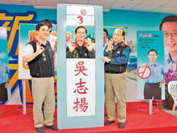 選前最后周日,吳志揚(yáng)扮演“人體選票”,臺北市長郝龍斌(左)、臺中市長胡志強(qiáng)(右)幫他站臺。圖片來源:臺灣《中國時(shí)報(bào)》