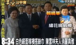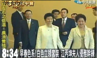 陳云林夫人賴曉華身著白色印花外套,再搭配上藍色絲巾,被贊俏麗典雅。 來源:臺灣中天電視臺