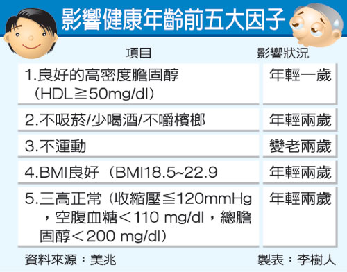臺(tái)北美兆健管中心院長朱大維表示,馬英九幾乎每天慢跑運(yùn)動(dòng),光這項(xiàng)這可年輕兩歲。另根據(jù)最近一次的體檢資料,他的身體質(zhì)量指數(shù)(BMI)在正常范圍內(nèi),健康年齡可再減少兩歲。 另外,馬英九不煙、不酒、不嚼檳榔且三高正常,血脂肪檢測(cè)結(jié)果也正常,評(píng)估健康年齡至少比實(shí)際年齡年輕近10歲。