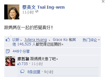蔡英文臉書人氣依舊,母親節合照有14萬多名網友按贊關注。馬英九前天所刊出的《慈母良師一甲子,永世難報養育恩─悼亡母厚修女士》一文,也有近17萬網友按贊。(中國臺灣網 周劍)