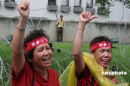 圖為兩名女性在警方設置的蛇籠前舉起倒扁手勢,高呼“阿扁下臺”的口號。 中新社發 董會峰 攝