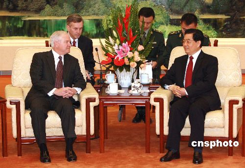 十一月六日,中國國家主席、中央軍委主席胡錦濤在北京人民大會(huì)堂會(huì)見美國國防部長羅伯特·蓋茨。 中新社發(fā) 廖文靜 攝