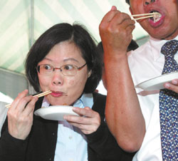 “拜票輕松”:民進(jìn)黨主席候選人蔡英文(左)2日拜會民進(jìn)黨“立法院”黨團(tuán)尋求支持,并參加在臺“立法院”內(nèi)廣場舉行的恒春洋蔥料理促銷活動,品嘗優(yōu)質(zhì)洋蔥料理。(臺灣《中國時(shí)報(bào)》圖片)