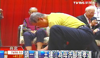 “監察院”先前也辦過慶生會幫母親洗腳,王建煊透露,母親先前一直覺得“大男人洗腳成何體統”,不肯參加。這次是家人游說,母親才同意讓兒子幫她洗腳。