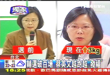 蔡英文本來就不是瘦尖臉形,現(xiàn)在看起來,雙頰下巴更成了一道圓弧線,體重增加3公斤,賣力抬轎輔選,怎么會越抬,自己越福態(tài)?蔡英文稱,“因?yàn)樾谐瘫容^緊湊,吃的地方都不定時,也不知道在哪里,所以每一頓都要吃得很飽!