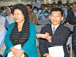 楊秋興與陳菊昨天在高雄市一場單國璽新書發(fā)表會上相遇,兩人沒有互動,楊的手勢好像在介紹“這是菊姐”。圖片來源:臺灣《中國時報》