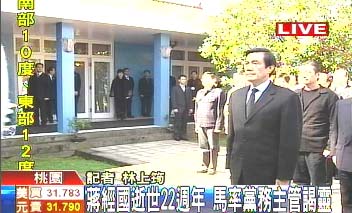 蔣經國逝世22周年,頭寮陵寢一大早就有不少民眾前往鞠躬獻花,馬英九上午10時30分,率領國民黨中央黨部秘書長金溥聰等黨務主管前往謁靈。