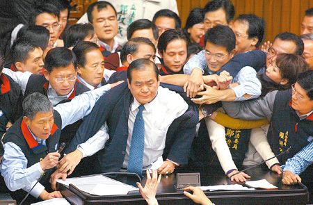 臺(tái)灣“立法院”昨天召開臨時(shí)會(huì)處理“地方制度規(guī)定修正草案”,三讀過程中藍(lán)綠“立委”上演全武行,混亂中多名“立委”掛彩。會(huì)議主席、“立法院副院長(zhǎng)”曾永權(quán)在在藍(lán)綠“立委”團(tuán)團(tuán)包圍、不斷推擠沖中,歷時(shí)近2小時(shí),才三讀通過審議。