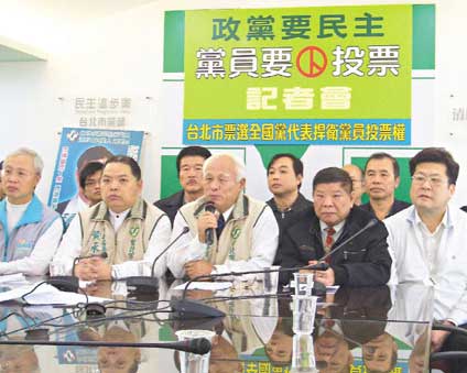 10多位民進黨代表昨天齊聚民進黨臺北市黨部,高呼“政黨要民主、黨員要投票”,吁民進黨中央三思,不要漠視黨員價值。圖片來源:臺灣《聯合報》