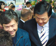 國(guó)民黨臺(tái)北縣黨部新主委布達(dá)典禮,黨中央秘書長(zhǎng)金溥聰(中間左)與縣長(zhǎng)周錫瑋互動(dòng)熱絡(luò)。圖片來(lái)源:臺(tái)灣《聯(lián)合晚報(bào)》