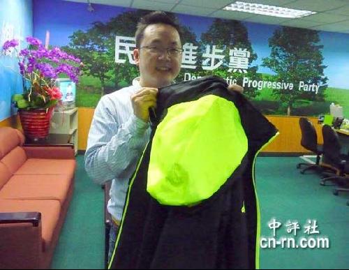 民進(jìn)黨新制服曝光(中評社 鄒麗泳攝) 新制服的帽子內(nèi)緣是螢光綠,夜晚視線不佳時(shí)很容易辯識。(中評社 鄒麗泳攝)