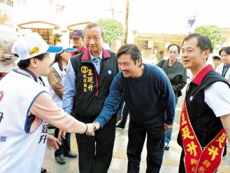 國(guó)民黨秘書長(zhǎng)金溥聰(右二)上午陪為國(guó)民黨籍花蓮“立委”候選人王廷升(右一)助選,稱蕭美琴欠臺(tái)灣人民一個(gè)道歉。 來(lái)源:臺(tái)灣《聯(lián)合晚報(bào)》