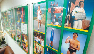 如果來(lái)到蔡同榮研究室,一定不會(huì)搞混,因?yàn)橐淮蜷_房間門,就是蔡同榮兩大巨幅人頭照,再往前望去,一整排的個(gè)人記錄照片更是精采,不但有他與夫人結(jié)婚的照片、女兒結(jié)婚時(shí)與父親共舞的照片、最經(jīng)典的當(dāng)然就是蔡同榮最引以為傲的裸上半身之胸肌玉照,張張精采,簡(jiǎn)直就是用照片寫出一部自傳。