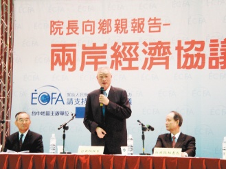 臺(tái)當(dāng)局“行政院長”吳敦義昨天出席兩岸經(jīng)濟(jì)協(xié)議座談會(huì),對(duì)鄉(xiāng)親和業(yè)界說明ECFA問題。來源:臺(tái)灣《聯(lián)合報(bào)》
