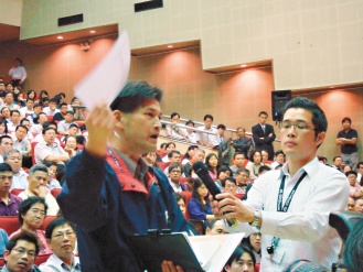 臺(tái)當(dāng)局“行政院長”吳敦義昨天出席兩岸經(jīng)濟(jì)協(xié)議座談會(huì),對(duì)鄉(xiāng)親和業(yè)界說明ECFA問題,臺(tái)下觀眾熱烈提問。來源:臺(tái)灣《聯(lián)合報(bào)》