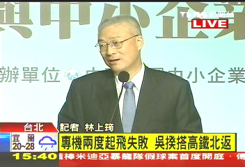 據(jù)報道,吳敦義上午到高雄出席活動,傳出專機發(fā)生問題,改搭高鐵回臺北的吳敦義一行人,下午終于出現(xiàn)在中小企業(yè)的會面行程。吳敦義一開頭,先述說自己的“專機驚魂”經(jīng)過。他說:“在小港機場的那部飛機,因為起飛的速度不夠,所以虛驚過兩次,所以機長來報告我說,以安全為重,所以后來改搭高鐵回來。”