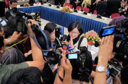 蕭至佑昨出席“兩岸簽訂ECFA后的商機”圓桌會議時刻意閃躲媒體記者,拒絕受訪。大批媒體追逐,蕭還害羞躲到駱怡君身后,出現“老板”替“特助”擋媒體的微妙畫面。(中國臺灣網 張辰劍)