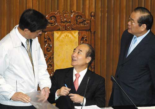 臺灣“立法院長”王金平(中)、“副院長”曾永權(右)、民進黨民代王幸男(左)在投票前交換意見。圖片來源:臺灣《聯合晚報》