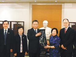 福建省長黃小晶(中)5日抵臺,首站拜會“同鄉(xiāng)”辜嚴倬云女士(右2)。圖為雙方互贈禮物留影。圖片來源:臺灣《中國時報》