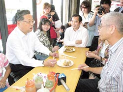 福建省長黃小晶(左一)在臺南市安平街區(qū)一家知名蝦卷店,邀請臺灣民眾一起享用美味的點心。圖片來源:臺灣《中國時報》
