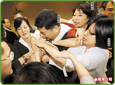 中國臺灣網(wǎng)5月11日消息 據(jù)臺灣《蘋果日報》報道,臺灣“立法院”國民黨團昨強勢動員,在“立院內(nèi)政委員會”初審?fù)ㄟ^攸關(guān)采認大陸學(xué)歷的“兩岸人民關(guān)系條例”修正草案,會議主席張慶忠要主持會議,遭民進黨民意代表林淑芬、陳亭妃強力阻撓,多名民意代表拉扯成一團(上圖)。民進黨民意代表邱議瑩更情緒激動,拿起主席臺上的法律參考書籍當(dāng)場撕毀(下圖)。(中國臺灣網(wǎng) 高大林)