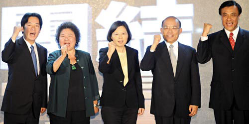 民進黨“五都”造勢活動昨日舉行,大臺中市長提名人蘇嘉全(右起)、臺北市長提名人蘇貞昌、新北市長提名人蔡英文、大高雄市長提名人陳菊、大臺南市長提名人賴清德。圖片來源:臺灣《聯合報》