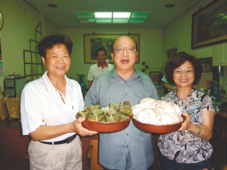 外埔鄉(xiāng)長劉陳吻(左)昨天贈(zèng)送包子與粽子給臺中市長胡志強(qiáng)(中),讓胡市長非常高興。圖片來源:臺灣《聯(lián)合報(bào)》