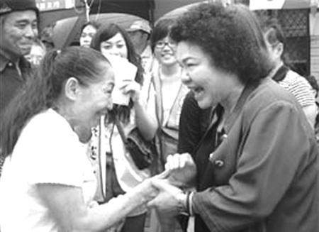 所謂“五大都”選舉,就是臺北市、新北市(原臺北縣)、大臺中(臺中市、臺中縣合并)、大臺南(臺南市、臺南縣合并)和大高雄(高雄市、高雄縣合并)的五個“直轄市長”選舉。大高雄地區(qū)向來是民進黨的大本營,而此次民進黨推出的候選人陳菊就是現(xiàn)任高雄市長,優(yōu)勢明顯。盡管如此,國民黨并沒放棄,派出同是女將的黃昭順應(yīng)戰(zhàn)。但選舉造勢才剛剛熱身,兩位女士的手已經(jīng)有些吃不消了。
