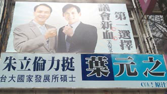 市議員參選人葉元之與朱立倫合照,卻因為朱立倫被提名為國民黨副主席,已屬違規,恐遭要求撤下。 圖片來源:臺灣《聯合報》