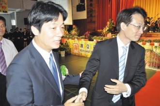 大臺(tái)南市長(zhǎng)參選人賴清德(左)和郭添財(cái)(右)昨天在臺(tái)南大學(xué)畢業(yè)典禮上“王見王”,相互握手致意。(圖片來(lái)源:臺(tái)灣《聯(lián)合報(bào)》)