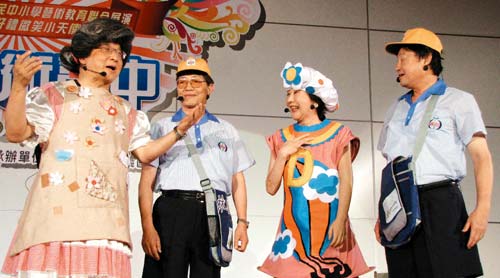 臺(tái)中市長胡志強(qiáng)(左)9日晚偕同夫人邵曉鈴(右2)參加臺(tái)中市各小學(xué)微笑暨藝術(shù)小天使表揚(yáng)大會(huì),兩夫妻粉墨登場演出短劇。胡志強(qiáng)化身為另類“魔法阿嬤”,教大家施展神奇的“可愛光波”貼紙。